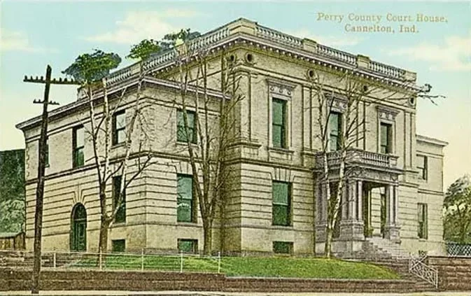 Government officials floated county records downriver from Rome to Cannelton on barges, although no courthouse existed at the time. The first courts were temporarily held in sandstone-block schoolhouse for the next 40 years, while the new courthouse was being planned.